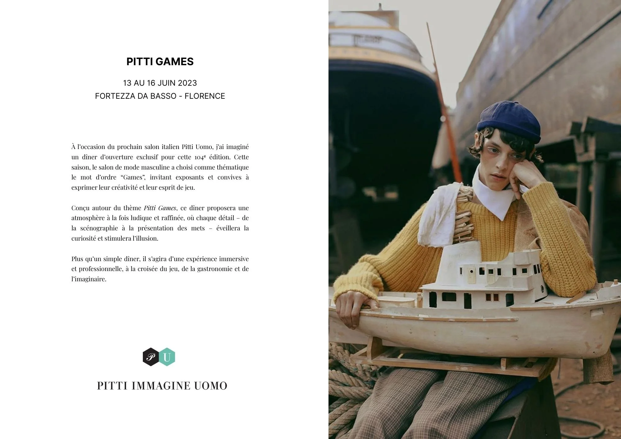 Conception d’un événement fictif dans le cadre du salon professionnel Pitti Uomo.